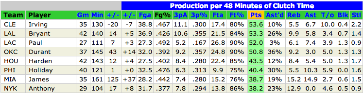 Take a look at the top eight point-scorers in crunch time last season, courtesy of 82games.com: