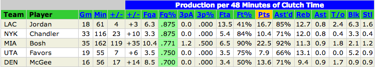 As you can see, the top five most efficient scorers in these situations were all centers, players who normally shoot better percentages then the rest of their teams due to the nature of their close-to-the-basket shots. Were they more efficient in the clutch than their peers, or simply more efficient than their peers in general?