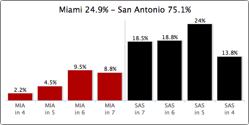 TeamRankings’ models overwhelmingly favor the Spurs, with each San Antonio winning outcome more probable than the most probable Miami outcome. I doubt the series will be this lopsided, but be careful not to simply disregard the graph because of conventional opinions – TeamRankings’ projections have correctly picked the winner of 11 of the 14 playoff series so far.