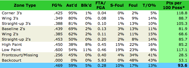 One of the staples of the triangle offense is mid-range shooting. Michael Jordan and Kobe Bryant made their livings in the middle area, and Carmelo Anthony and the Knicks have been the same. As a matter of fact, 43% of the Knicks’ shot attempts have come from the mid-range, the most in the NBA. And those shots have to come away from somewhere: New York is dead last in the NBA in points in the paint per game AND free throw rate, third to last in fastbreak points per game (which usually come in the paint), and second to last in corner threes attempted. I think the name of our website shows how we feel about that stat, and no wonder – Daryl Morey’s Houston Rockets have taken the most corner threes in the league, and they’re 6-1. Check out this points per possession table, courtesy of 82games.com: