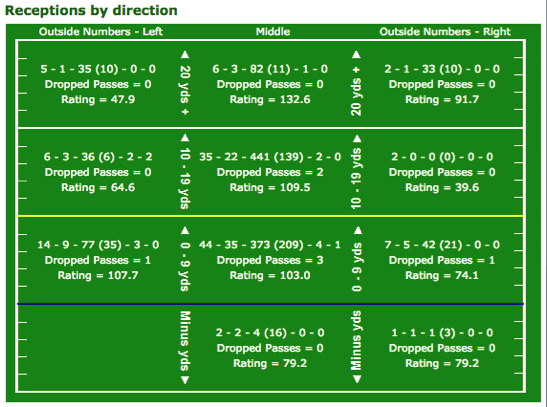 Everyone recalls the Ravens beating the Patriots in the 2012 AFC Conference game. But what most people may forget is that Rob Gronkowski did not play in that game due to injury. Gronk has had to fight the injury-prone label, and has battled some major injuries over the past few seasons. However, in 2014, he did not miss a single game due to injury, and was huge all year for New England. Gronkowski accounted for 20.4% of Brady’s regular season passing yards, and caught 12 of Brady’s 38 touchdown passes. Last week, the Ravens allowed Steelers’ tight end Heath Miller to haul in six receptions on nine targets for 76 yards. Miller did the majority of his damage in the middle of the field in between the first down marker and the line of scrimmage, while the graphic below shows Rob Gronkowski’s receptions by direction during the regular season.