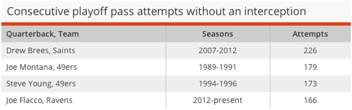 Joe Flacco has played as close to perfect football as one can play over his past five playoff games. He’s thrown 13 touchdown passes, no interceptions, has averaged 279.8 yards per game, and has won all five of those games. The image below shows just how impressive Flacco’s playoff streak without an interception is.