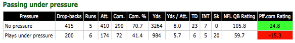 The key for the Patriots’ defense will be applying pressure to Flacco. When under pressure, he becomes a completely different QB, as the graphic below shows.