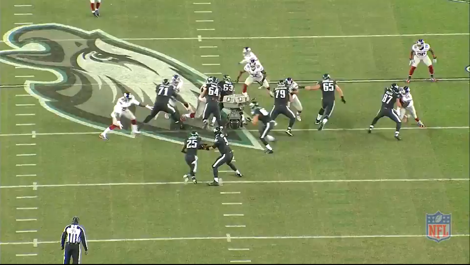 Another stat that truly shows how much the Eagles offensive line aided LeSean McCoy last season is ProFootballFocus’ Elusive Rating. The Elusive Rating boils down a runner’s success beyond the point of being helped by his blockers. Although McCoy is thought of as one of the most elusive runners in the league, his 28.9 elusive rating is 31st best out of 42 running backs. During the Eagles’ week six matchup against the New York Giants, McCoy rushed for 149 yards, which was his second-highest total on the year. The images below show just how easy the Eagles’ offensive line made it for McCoy that night.