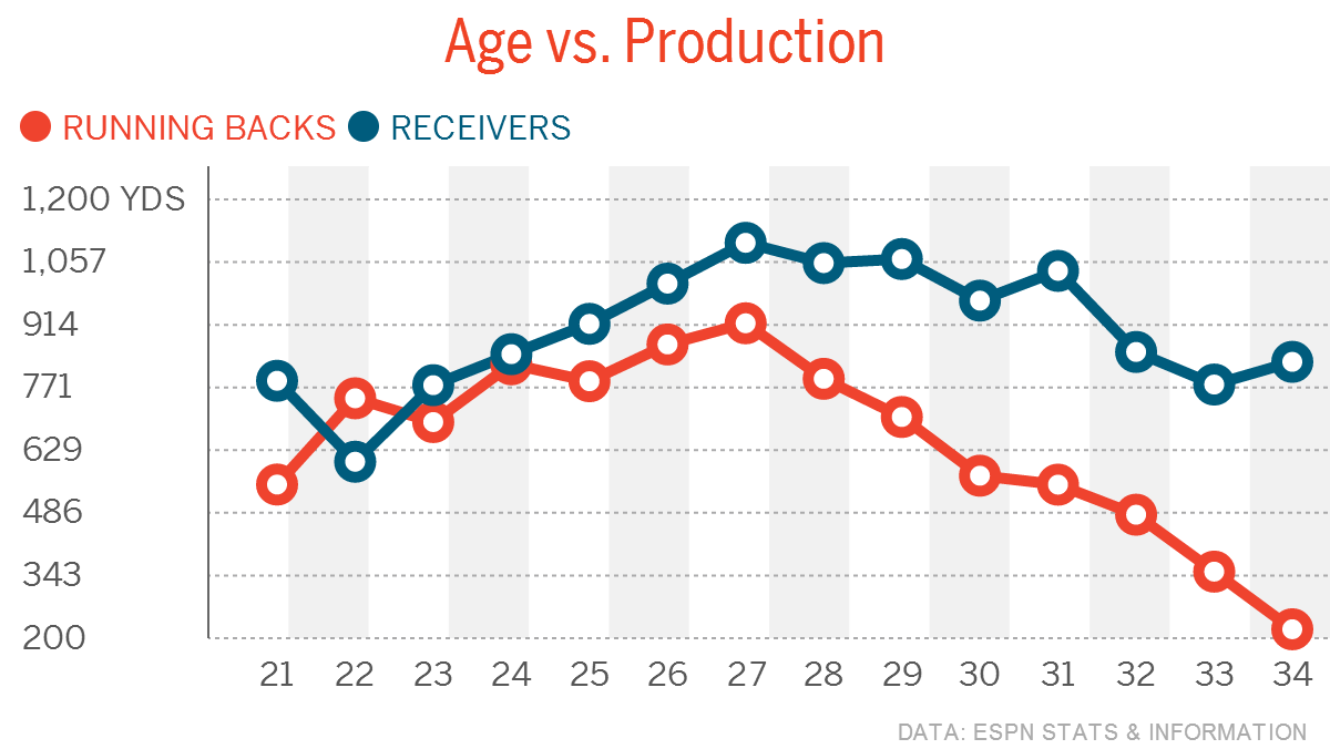 McCoy’s stock itself may be falling as well – everyone has heard the cliché that running backs’ production falls off once they turn 30. A closer look at the numbers shows that they may be off a few years.