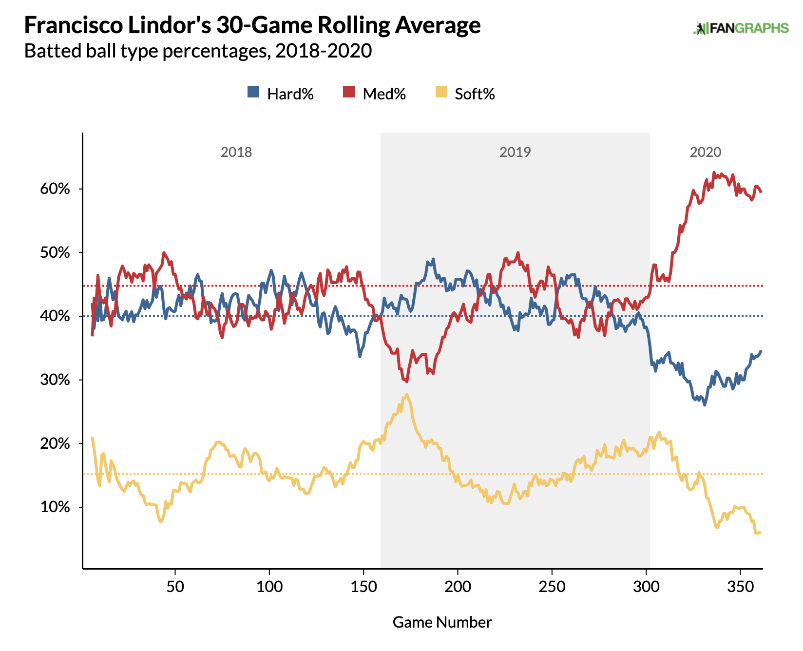 “Lindor’s 2018 was his best year, and since then he’s lost some of his discipline at the plate, chasing more breaking stuff at the edges of the zone and out of it, resulting in small hits to his walk and strikeout rates and OBPs well below his 2018 peak. There’s nothing in his batted-ball data to say he can’t hit as he did in 2018, and perhaps a new environment and better team will convince him to go back to his earlier, more patient approach.”
