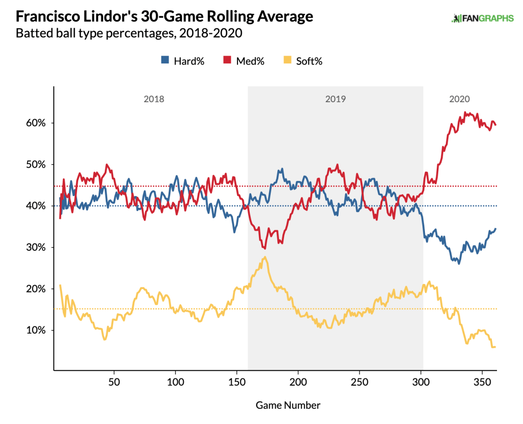 Per Fangraphs data, the biggest concern was likely his hard-hit percentage, which clearly dipped from 2018/2019 levels in the shortened 2020 season. Interestingly, though, his soft-hit percentage also took a dip: